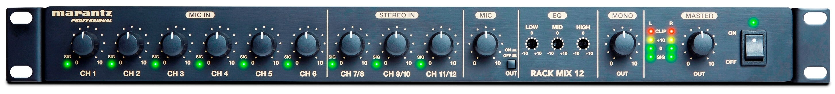 - Mixer de áudio com 12 canais: 6 MIC/LINE (XLR) + 6 LINE (RCA)