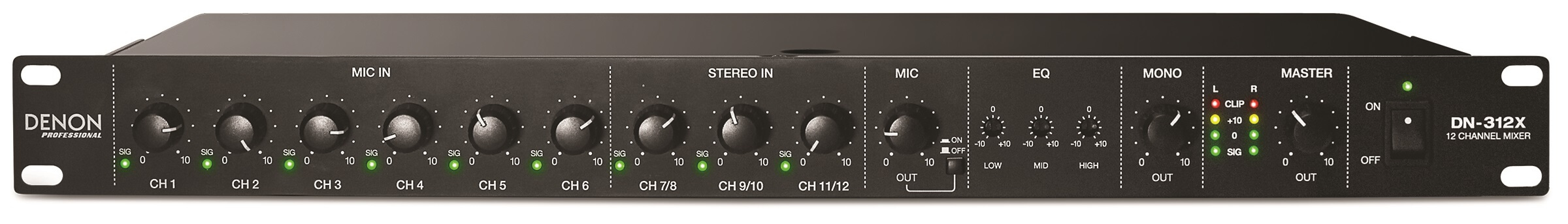 Mixer de áudio 12 entradas MIC/LINE, 1u de altura, equalizador de 3 bandas - DN-312X