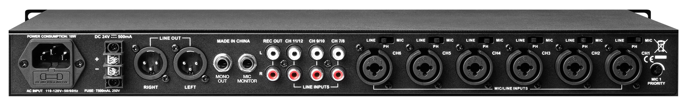• Mixer de áudio com 12 entradas MIC/LINE, sendo 6 tipo MIC/ LINE e mais 6 tipo LINE