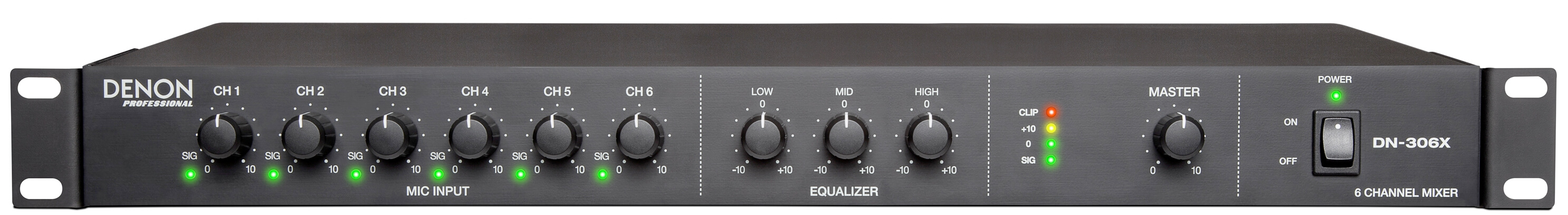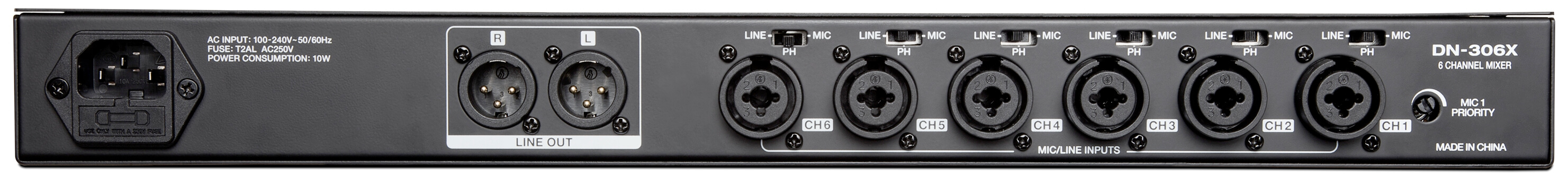 Mixer de áudio 6 entradas MIC/LINE, 1u de altura, equalizador de 3 bandas - DN-306X