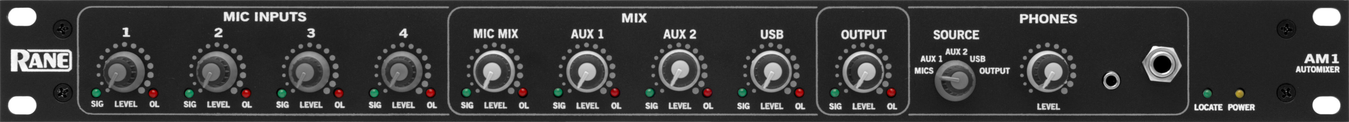 - Expansível, por conexão a mixers AM2, para até 62 entradas Mic/Line (conectando um AM1 a 7 AM2)