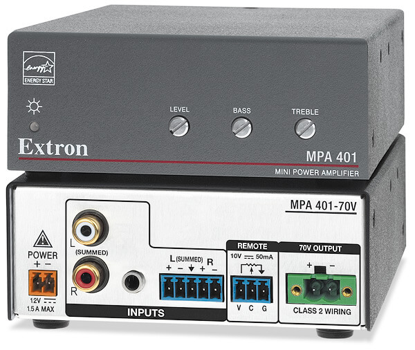 - Amplificador compacto, altamente eficiente, classe D, da série MPA, projetado e fabricado pela Extron, qualificado no programa ENERGY STAR .