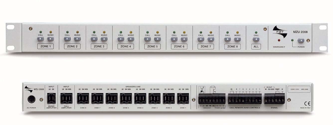 - As duas entradas da unidade são alimentadas por 2 pré-amplificadores, um para voz e outro para música. As 8 saídas da unidade alimentam 8 amplificadores de áudio dedicados à difusão nas 8 zonas