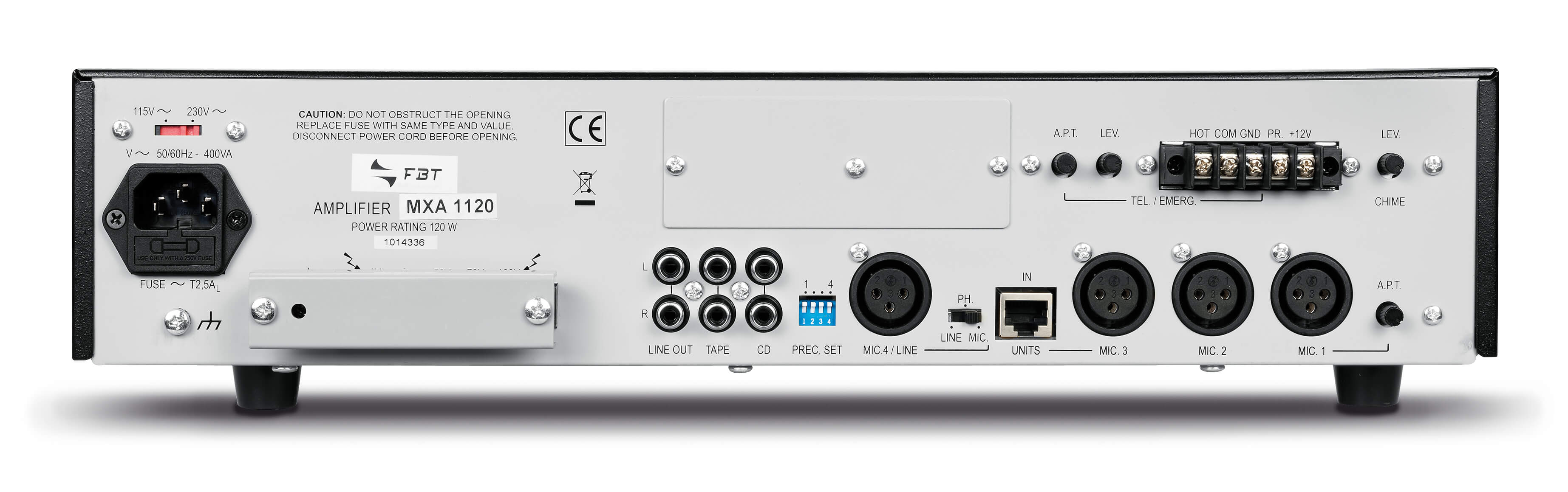 - Amplificador com mixer interno e recursos de chamada (paging) por zona
