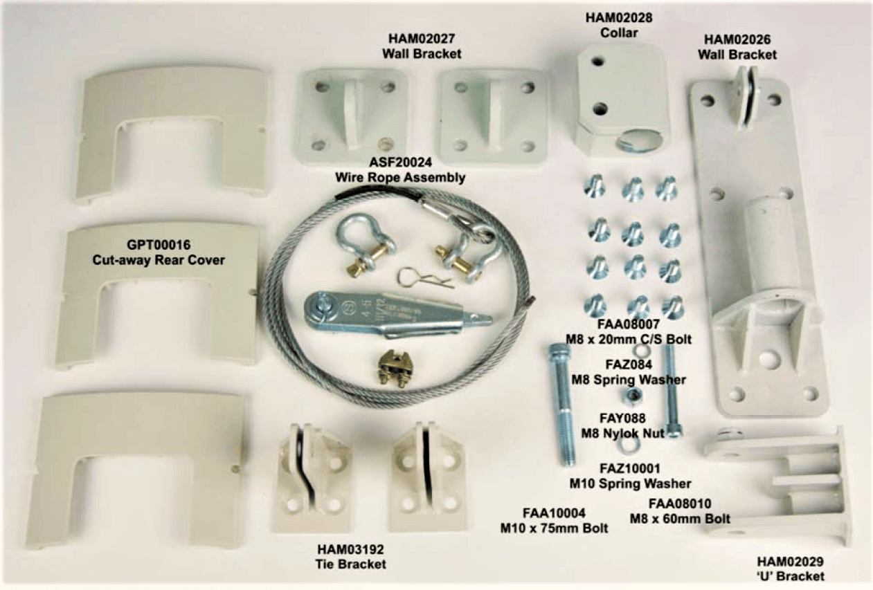 - O kit possui um suporte de parede grande e um suporte em U semelhante e um colar preso à parte inferior da matriz