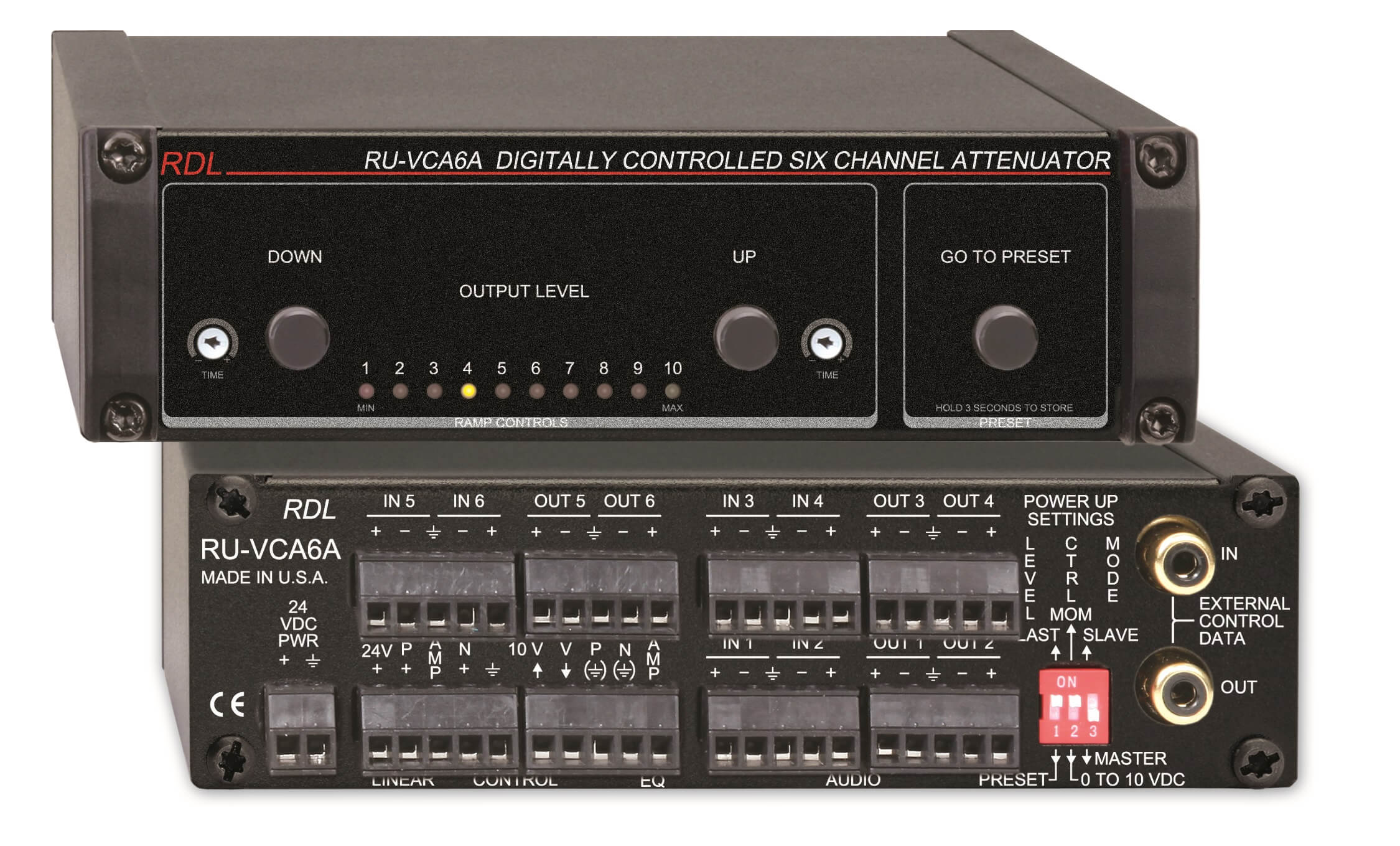 - Os equipamentos RU-VCA2A e RU-VCA6A são atenuadores de áudio, de dois e seis canais, respectivamente, qualidade estúdio, que permite controle local e remoto de sinais em nível LINE