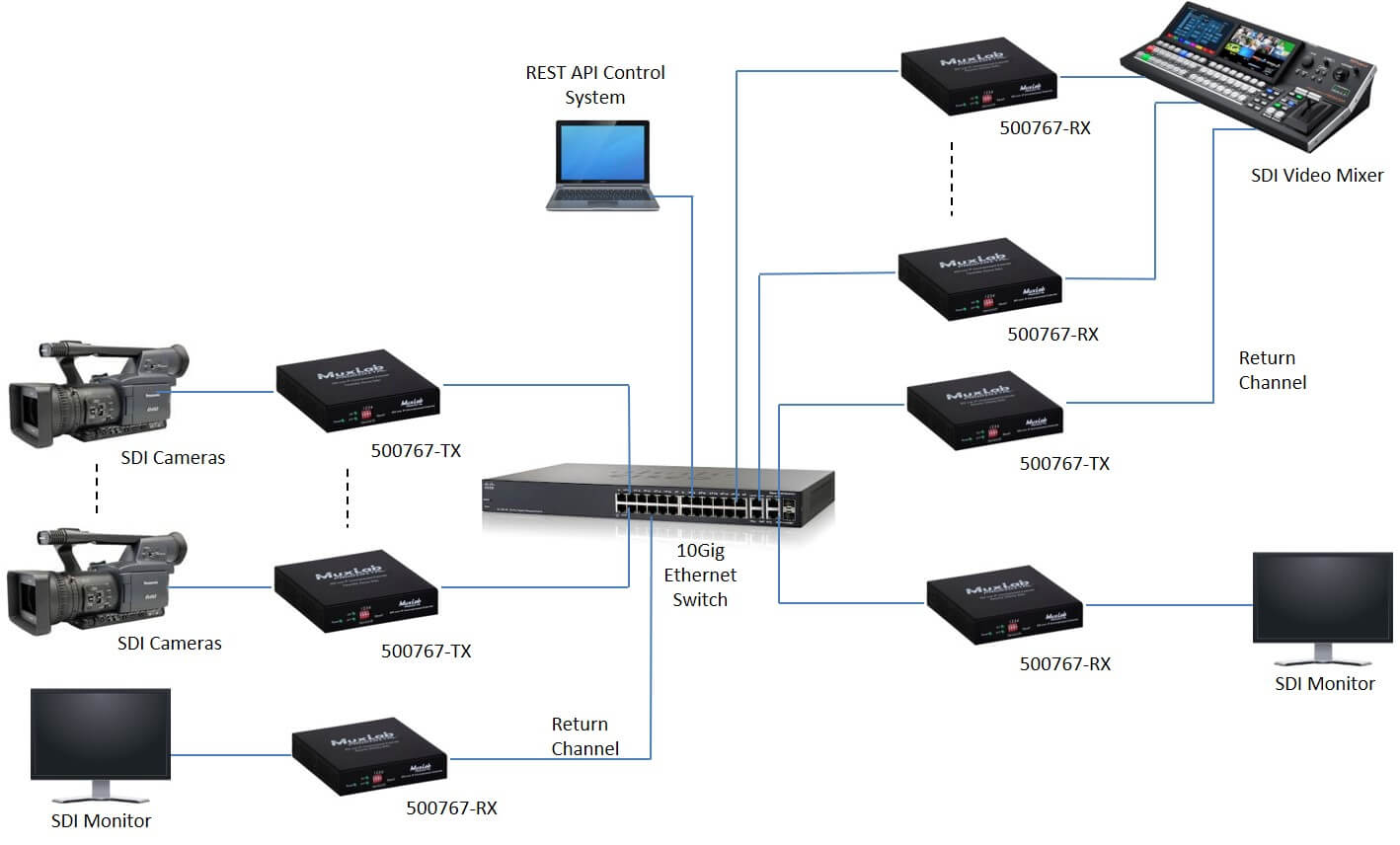 Permite que os equipamentos HD-SDI e 3G-SDI sejam se comuniquem em enlaces de até 30 m via cabo UTP cat 5e ou cat 6, ou até 400 m via fibra multimodo OM4 duplex com LC conectores