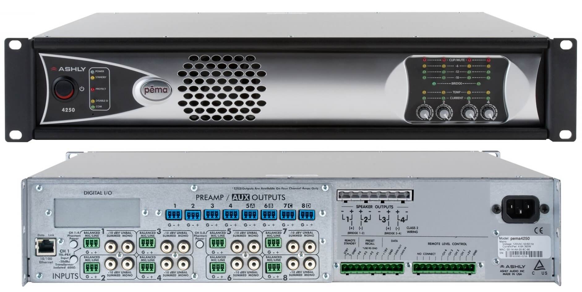 - A série de amplificadores Pema ™, da Ashly, com seu visual elegante, é formada por amplificadores equipados com DSP interno - Protea, com modelos de 4 ou 8 canais com 125 ou 250 Watts por canal