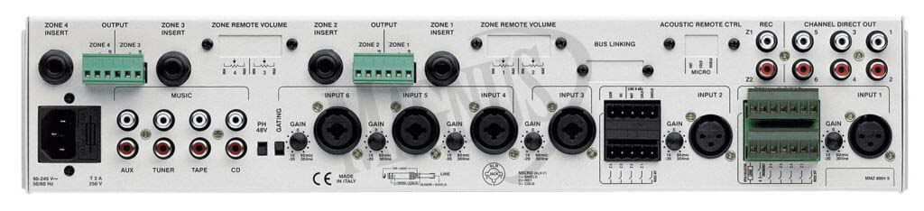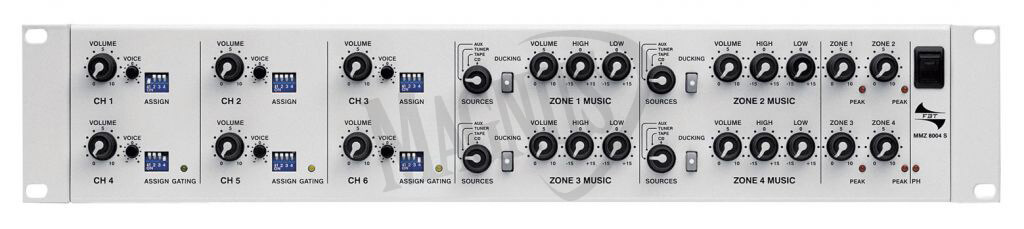 - Mixer de áudio com função de distribuição para 4 zonas e paging