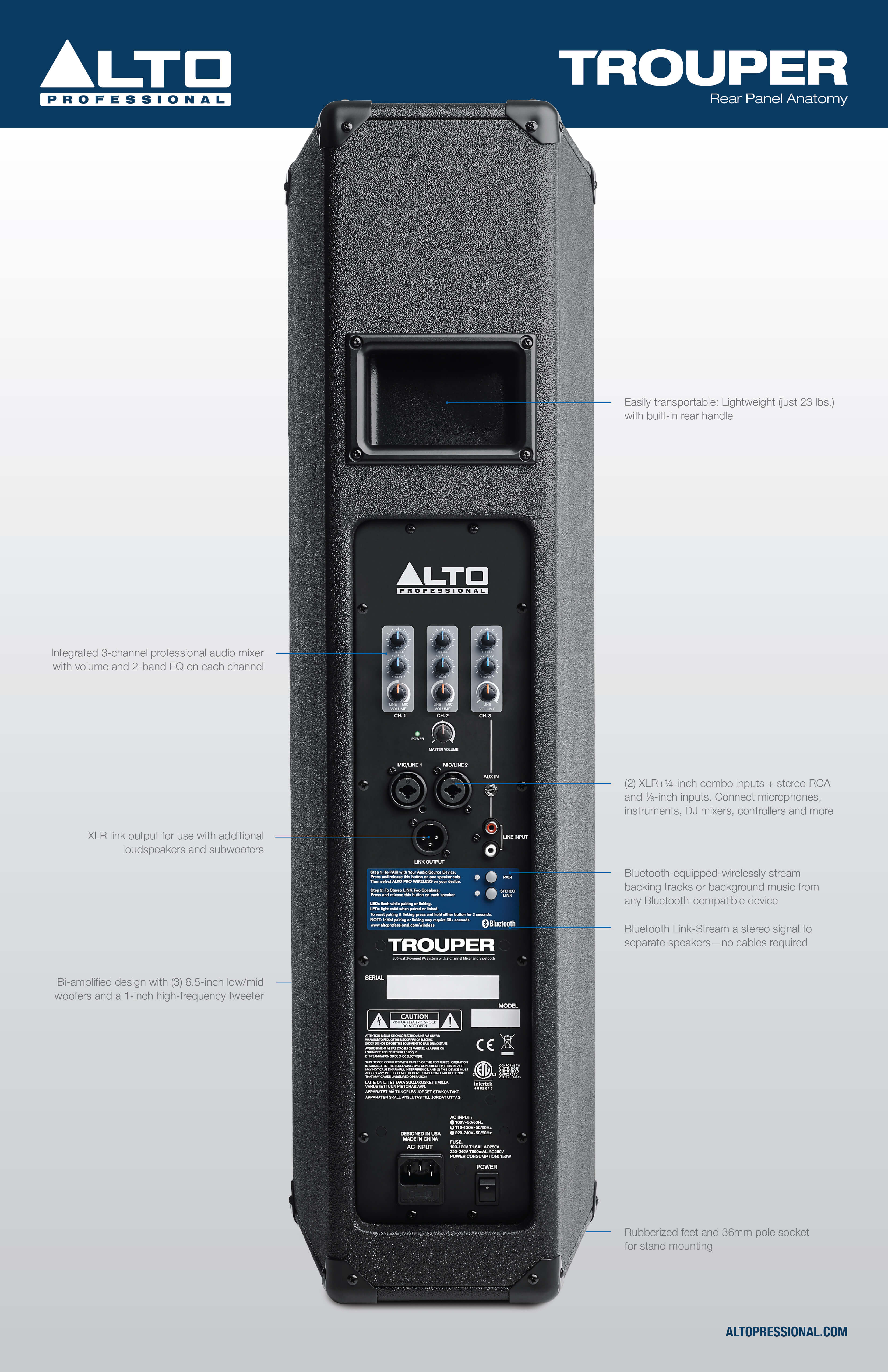 - Bluetooth: áudio streaming A2DP, com link estéreo quando usar dois Troupers