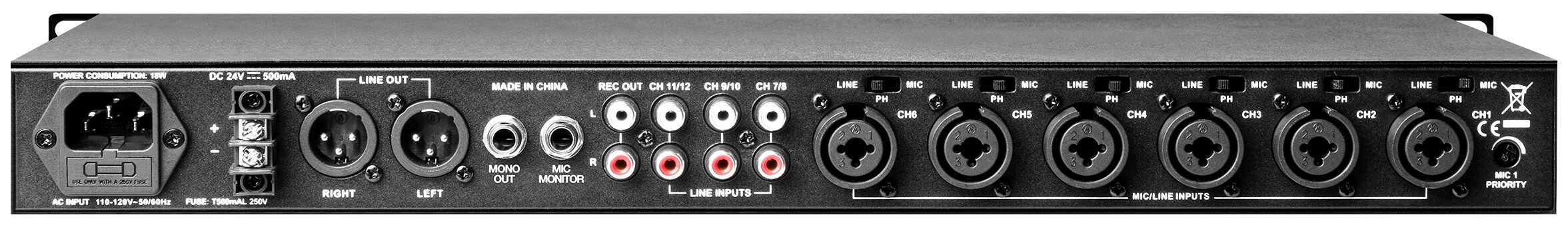 • Mixer de áudio com 12 canais: 6 MIC/LINE (XLR) + 6 LINE (RCA)