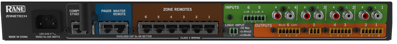 - 6 portas ZONE REMOTES para controle de volume e fonte de áudio, nas diversas zonas, usando Rane DRZH
