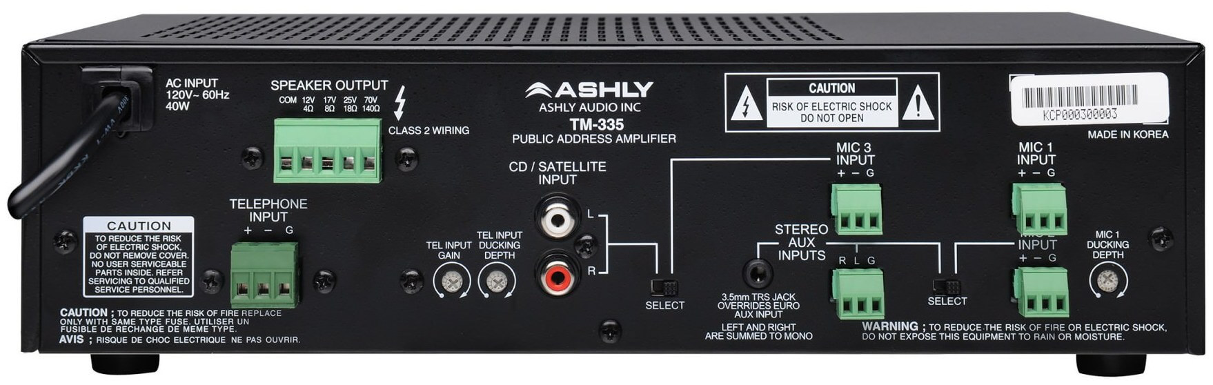 • Amplificador de áudio classe AB, 35 W @ 8 ohms e Linha de 70v