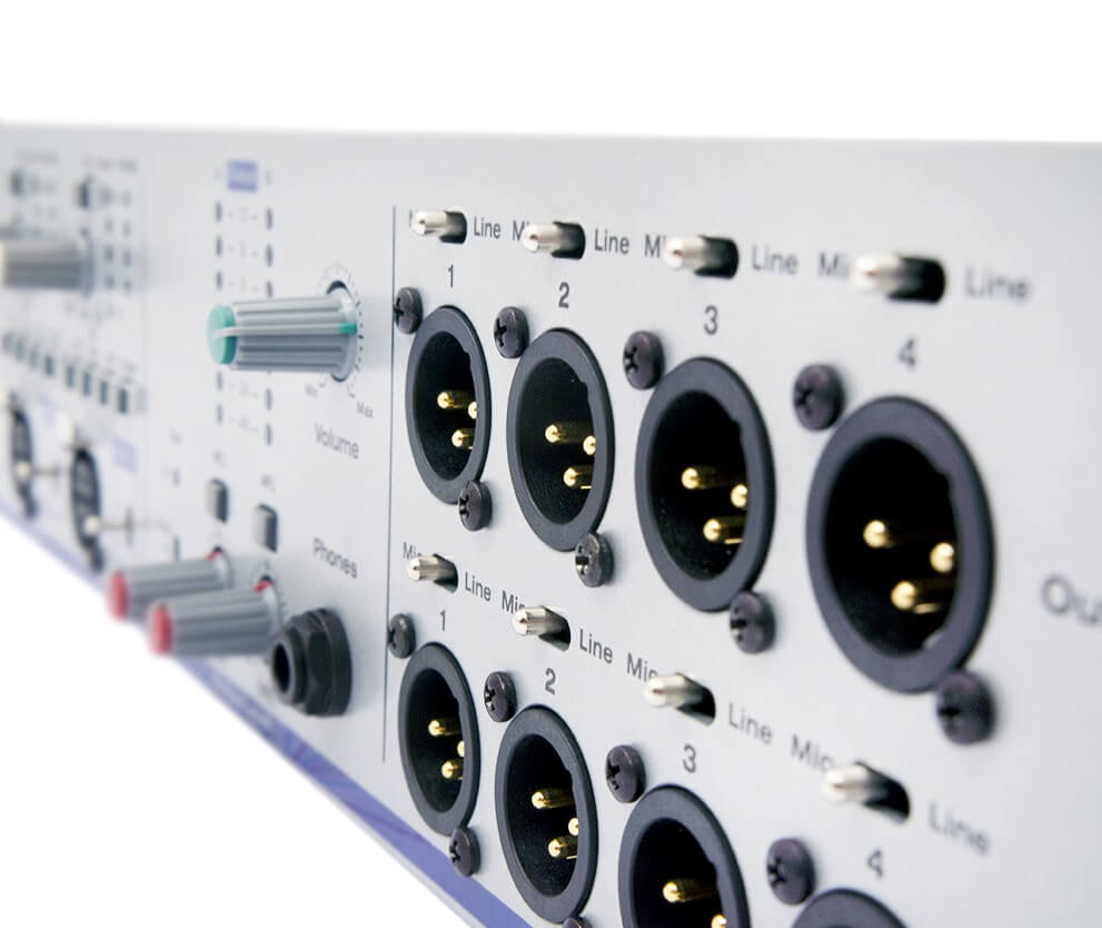 Interface de imprensa profissional, passiva, com 1 entrada e 8 saídas MICEntradas e saídas balancead..
