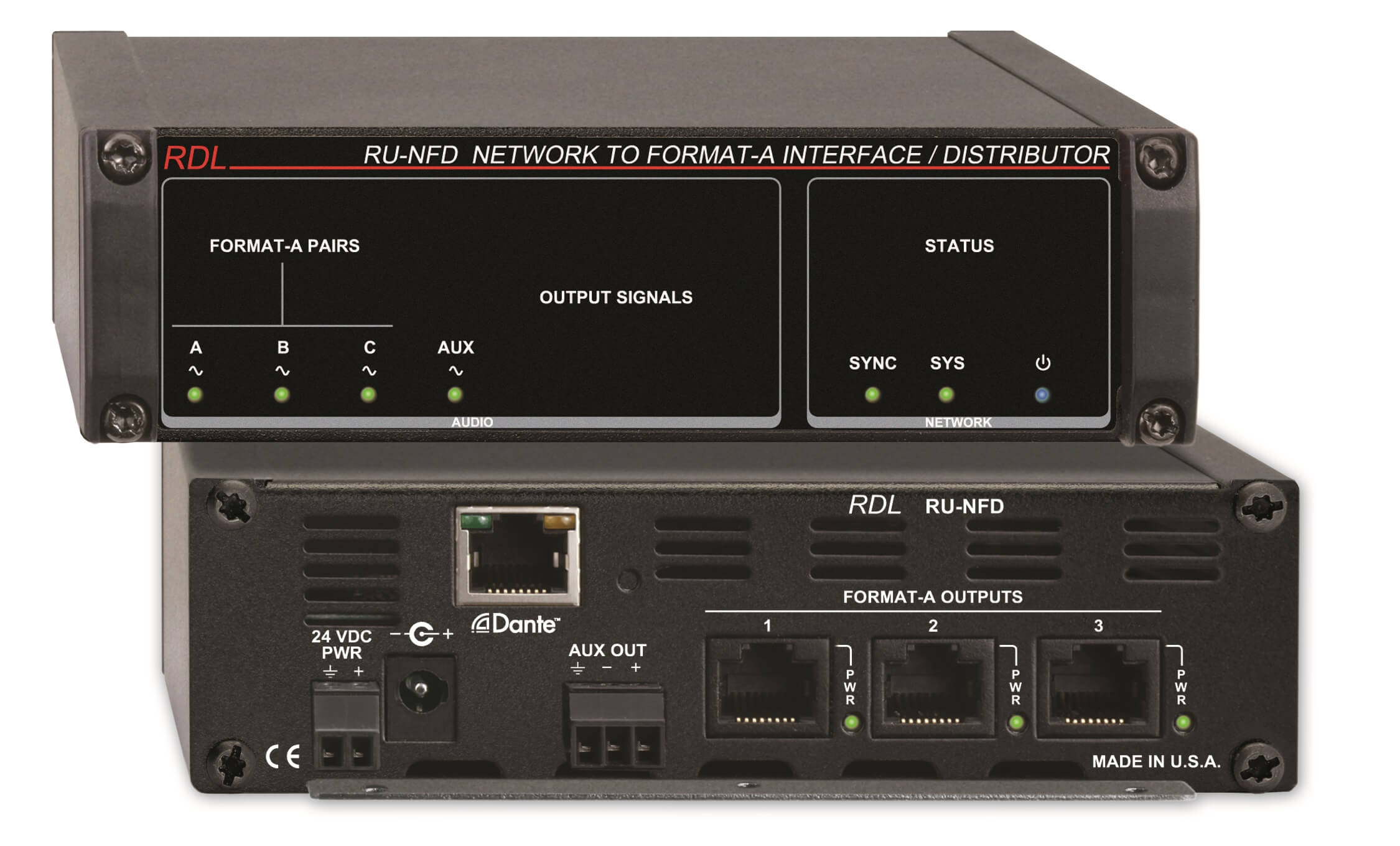O RU-FN converte 3 canais recebidos da rede DANTE para Format-A.